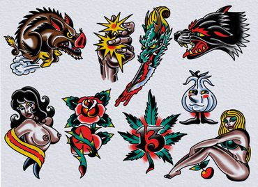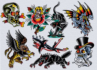 Designs are done as posted. Absolutely no design/outline changes. Designs will be done in color as shown on the flash sheet or in black & grey.